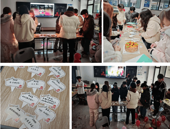 晚会结束后,集体生日庆典正式开启。班干部们推上精心准备的生日蛋糕,温馨的生日歌缓缓响起,现场灯光渐暗,点点烛光摇曳。在全班同学的共同祝福下,寿星们闭上眼睛,默默许下心中美好的愿望,随后一同吹灭生日蜡烛,分享甜蜜的生日蛋糕。班级还为每位寿星准备了生日小礼品,这份贴心的关怀让寿星们深切感受到了班级的温暖与关爱,他们表示,这是一次难忘的生日体验,将永远铭记这份温暖。