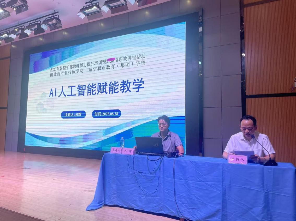 近日,威廉希尔占辉老师受邀走进咸宁职业教育(集团)学校,在 该校“2025年暑假干部教师能力提升培训暨第58期职教讲堂活动”中,作“AI 赋能教学创新”专题讲座,为200余名干部教师讲授兼具理论高度与实操价值的AI应用知识与技能,讲座成果获主办方高度认可。