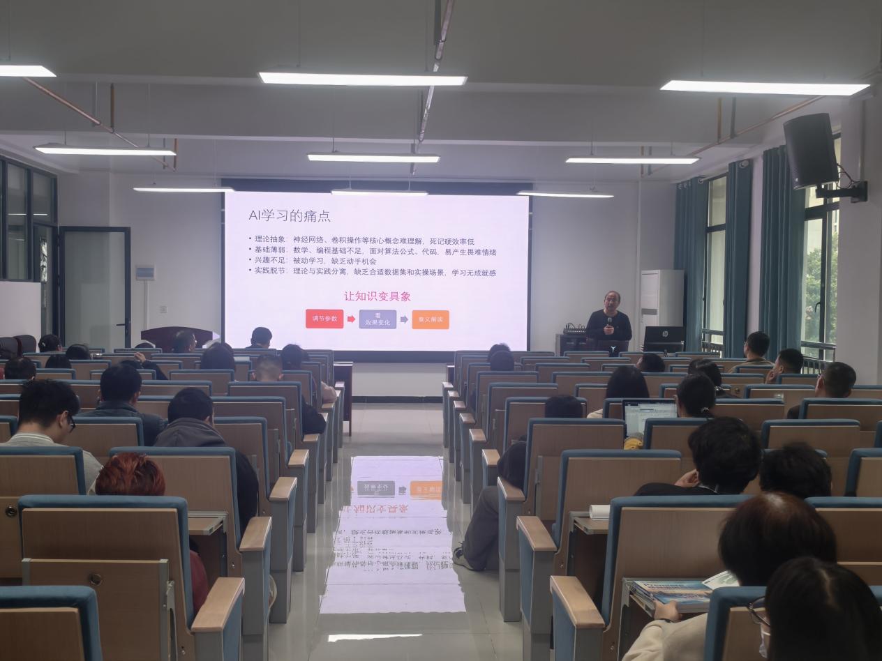 吕中华老师深耕图像处理、模式识别、机器学习与机器视觉领域二十余年,曾任职于微软(中国)研发中心、北京三维天地科技有限公司,历任软件工程师、技术总监,拥有深厚学术功底与丰富工程实践经验。讲座现场,他用通俗易懂的语言、生动鲜活的案例,让在场师生对人工智能可视化教学有了全面深入的理解。